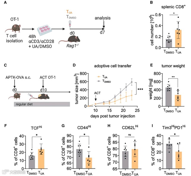 研究者们从 OT-1 供体小鼠(图 3A)中培养 T 细胞 48 小时(UA 或对照),然后过继转移到免疫缺陷 Rag1-/-小鼠。移植后 7 天,在接受了 UA 处理的 T 细胞的小鼠中,移植的 CD8+ T 细胞的数量更高(图 3B),支持增加的扩张潜力。此外,当 UA 条件下的 OT-1 T 细胞移植到具有可触及的过表达卵白蛋白 APTK (APTK- ova)肿瘤的小鼠(图 3C),这导致了与对照 OT-I T 细胞相比更强的肿瘤抑制(图 3D 和 3E)。对肿瘤的分析显示,在 UA-T 细胞转移后,肿瘤中 CD44 表达较低,而 TCF1HiCD8+ 肿瘤浸润 T 细胞数量较高(图 3F 和 3G)。这在肿瘤中符合 UA 诱导的记忆表型的维持,CD62L 表达保持不变(图 3H)。此外,与改善的记忆反应一致,接受 UA 预处理的 T 细胞的动物在TME中包含更少的 Tim3HiPD1Hi 最终耗尽的 CD8+ T 细胞(图 3I)。因此,UA 在过继细胞转移过程中增强了免疫介导的抗肿瘤记忆。