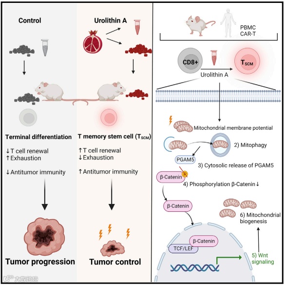T 记忆干细胞(TSCM)表现出增强的自我更新能力和延长的生存能力,从而防止 T 细胞衰竭,促进有效的抗肿瘤 T 细胞反应。TSCM 细胞可以被尿石素 A (UA)扩增。(UA)是由肠道微生物群系从富含鞣花丹宁的食物中产生的,已被证明可以改善线粒体健康状态。口服 UA 给荷瘤小鼠提供了强大的抗肿瘤 CD8+ T 细胞免疫,而体外 UA 预处理的 T 细胞在过继细胞转移后显示出更好的抗肿瘤功能。UA 诱导的 TSCM 的形成依赖于 Pink1 介导的自噬触发线粒体磷酸酶 Pgam5 的胞质释放。胞质 Pgam5 去磷酸化 β-catenin,驱动 Wnt 信号通路和代偿性线粒体生物发生。总的来说,研究者们揭示了一个连接自噬和 TSCM 形成的关键信号通路,并认为耐受性良好的代谢化合物 UA 是改善免疫治疗的一个有吸引力的选择。