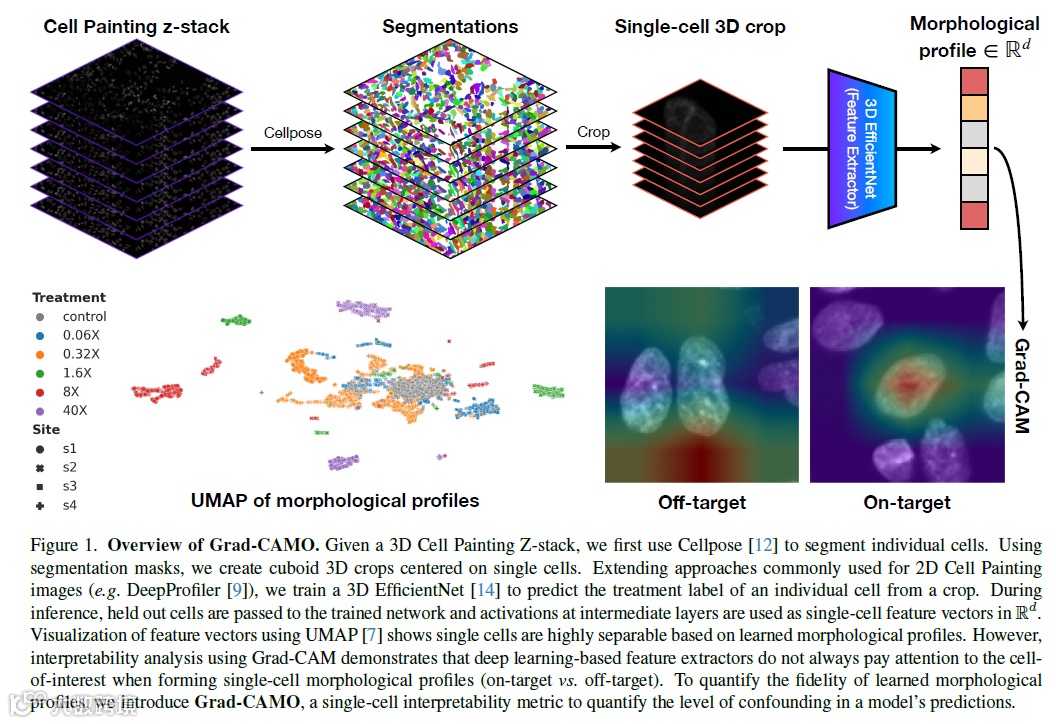 显微成像细胞分析算法有个特性就是黑匣子,这种特性有时会让我们怀疑是否模型真正分析的是生物学相关的内容。研究者们发现,算法模型有时会分析一些生物学不相关的像素,比如背景上某个噪点,为了研究相关性作者们引入了 explainability 可视化技术。在该本研究中,研究者介绍了 Grad CAMO(Grad-CAM Overlap),其可用于提供每个单个细胞的形态表征的生物相关性的定量度量,即能够测量模型对背景相对所关心细胞 attention 的比例,这种方法可以使科学家高能够审计每个表征和帮助优化深度学习架构。尽管该研究工作主要集中在 3D 图像上,Grad CAMO 还可扩展到 2D 细胞绘画图像,并可用于解释学术界和工业界使用的现有模型所做的描述。Grad CAMO 融入传统单细胞特征提取工作流如下图(Figure 1):
