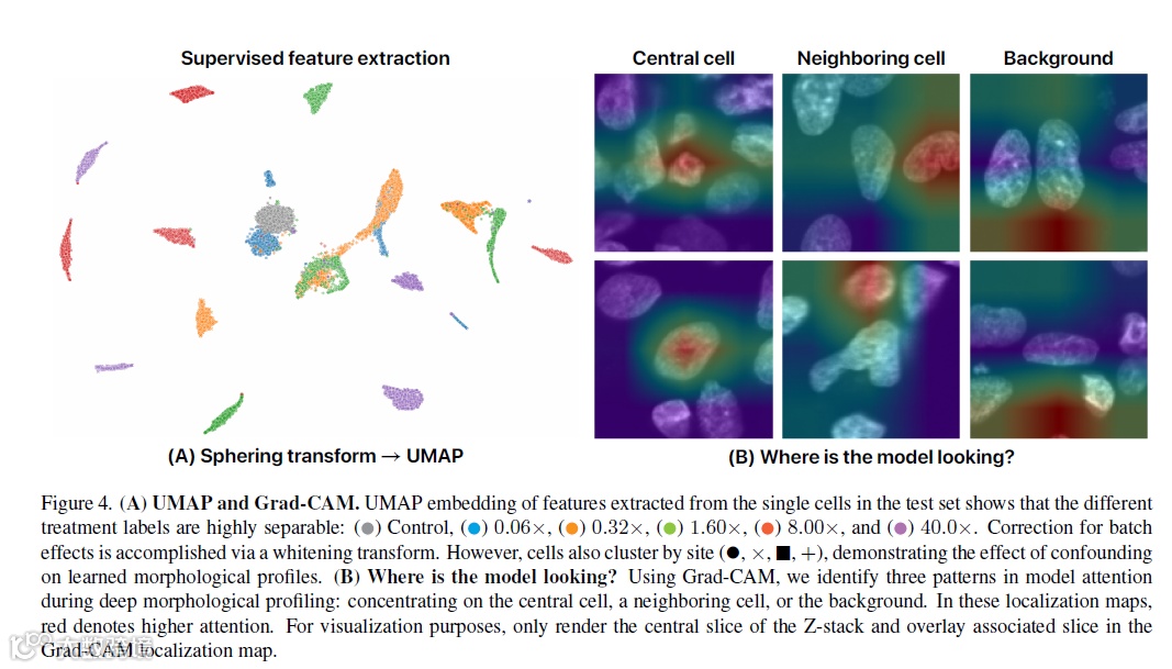 科学家使用该评价系统对 6 个浓度司他夫定处理的 3D 肝损伤模型(Hep G2)的进行评价。可视化学习的形态表证结果显示, 使用训练的 3D EfficientNet-B0 可以获取到不同处理的细胞可视化的形态学信息(Figure 4 A), 同时为了鉴定定量深度学习模型的正确性,作者们用 Grad-CAM 展示了深度学习提取的表征不总是能把注意力集中在所关心的细胞上,即有如上图所示 Off-Target 和 On-Target 的区别。作者选了模型中 3 个模式(patterns)来鉴定模型的注意力(attention),来鉴定“模型看向哪?”这个问题(Figure 4 B)。