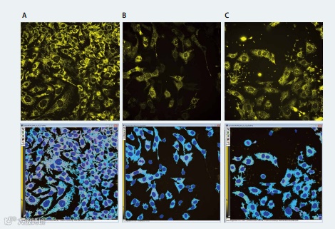 图 2 .化合物对线粒体的作用。使用MitoTracker Orange对线粒体进行染色( 黄色 ),对照组(A)、缬霉素(B)、鱼藤酮(C)。