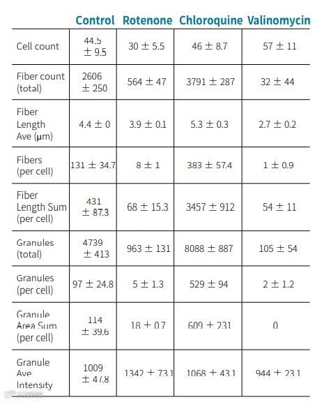表 2 .不同的对照和化合物处理方法的比较。上面四列数据分别是对照,10 um 的氯喹,300 nm 的鱼藤酮,和 10 nm 的缬氨酸霉素。