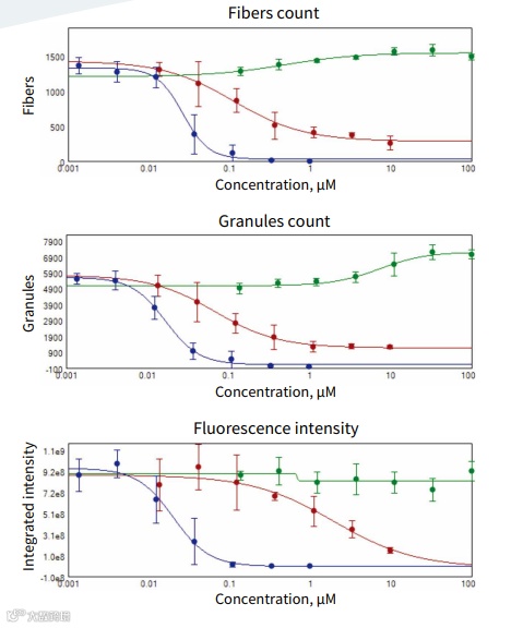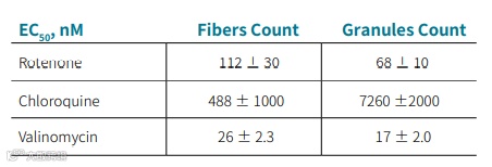 使用特定浓度的化合物(氯喹,鱼藤酮和缬氨霉素)处理 PC12 细胞,对细胞进行染色和成像。通过图像分析将线粒体结构确定为“纤维”(顶部)或“颗粒”(中部),底部为线粒体染色后荧光强度的变化。EC50的值取决于四个浓度依赖性复本和参数曲线的拟合(图 3)。