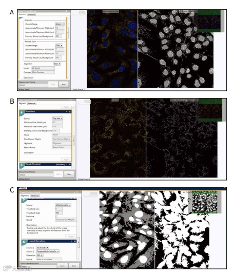 使用不同浓度的化合物,包括氯喹(抑制线粒体循环),鱼藤酮(氧化磷酸化抑制剂)和缬氨霉素(钾离子载体)处理 PC12(人神经母细胞瘤细胞)。将活细胞用线粒体染料 MitoTracker Orange 和 Hoechst 进行染色,利用 ImageXpress Micro Confocal 系统(Molecular Devices)进行成像,使用共聚焦模式和 40X 水镜拍摄活细胞的图像,分辨单个线粒体并检测线粒体形态变化。使用 MetaXpress 高内涵图像采集和分析软件中的 Custom Module Editor(自定义模块编辑器)分析图像,使用“Granularity”模块和“Find Fibers”模块识别圆形颗粒和细长的线粒体(图 1)。