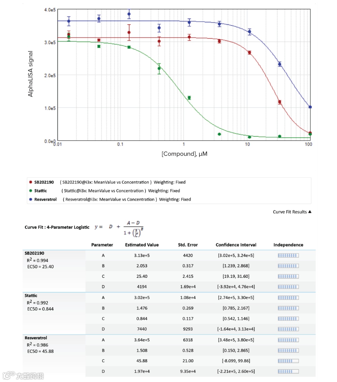 培养基从含有化合物处理的 THP-1 巨噬细胞的孔中移除,并使用 AlphaLISA 检测技术,对 SB202190、Stattic 和白藜芦醇抑制 TNFα 表达呈浓度依赖性。使用 SoftMax Pro 软件中的 4 参数曲线拟合绘制结果,EC 50 值自动计算(图 2)。曲线拟合设置包括计算统计数据的选项,包括一个独立参数,有助于评估给定曲线拟合对数据集的适用性。