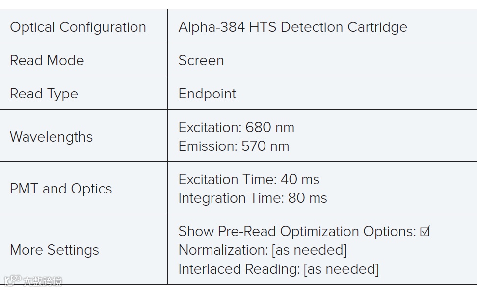 表 1:AlphaScreen 的 SpectraMax i3x 读板机的仪器设置参数