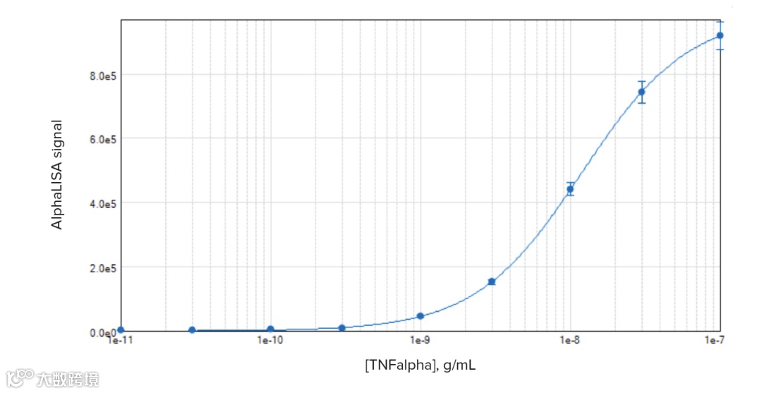 TNFα 标准曲线(图 3)可计算检测样品中的实际 TNFα 水平。所示曲线展示的是从 61.7 pg/mL 到 100 ng/mL 的检测窗口。AlphaLISA 信号范围完全涵盖来自 TNF α平均范围为 0.47 ng/mL 至 7.70 ng/mL 的处理细胞的样品。