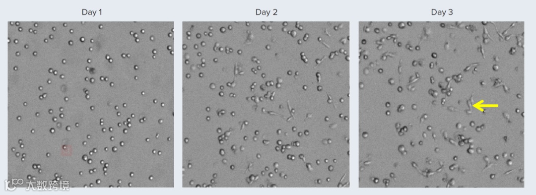 图 1:使用 MiniMax 细胞成像系统对 THP-1 细胞进行成像。在第 1 天,细胞表现出圆形形态。PMA 治疗 24 小时后(第 2 天),观察到延长和扁平的细胞,在第 3 天观察到更多此类细胞(黄色箭头)。