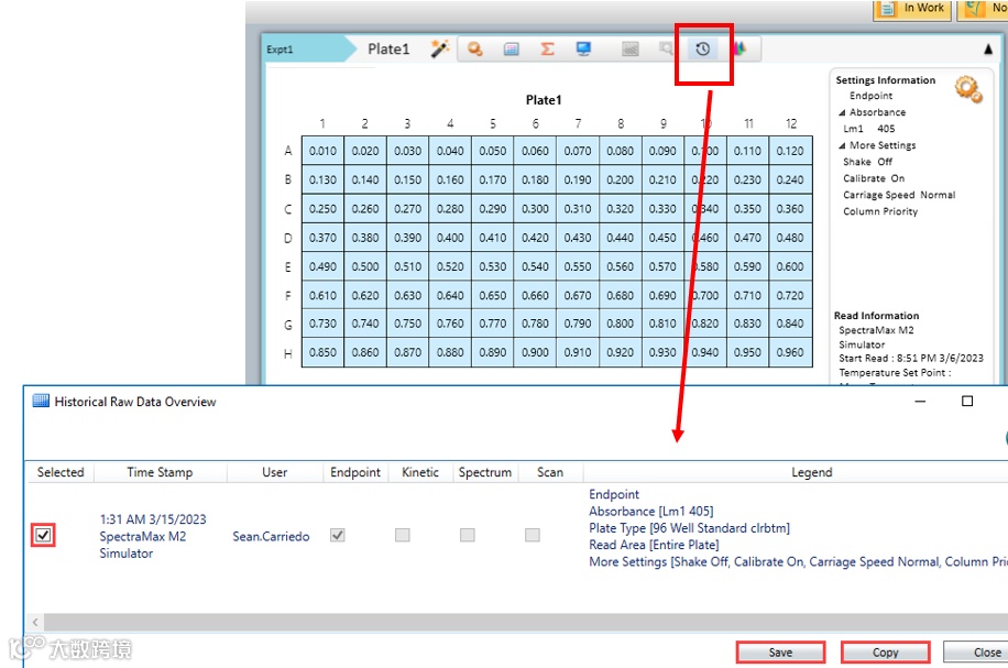而 7.2 版,新增了上图圈出的 historical data 功能,所有被覆盖的读板数据都可以直接 copy 至 plate 中,或者 save 至数据库外的文件中,从此覆盖数据不复存在了。