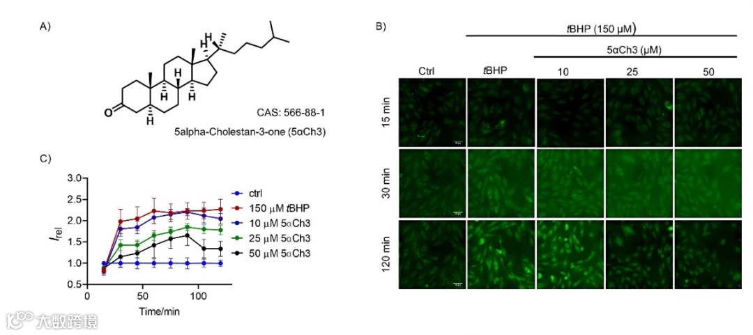 通过筛选作者从天然产物库中发现了 7,8-二羟基黄酮、青藤碱等中药活性成分具有良好的抑制超氧阴离子生成作用,特别是首次发现 5a-胆甾烷-3-酮能有效抑制过氧叔丁醇刺激导致的心肌细胞超氧阴离子积聚(图 4)。