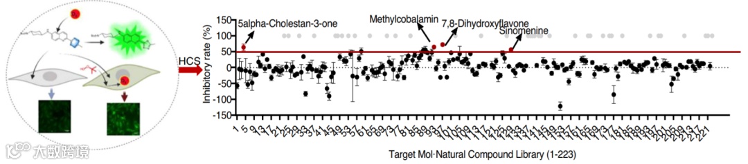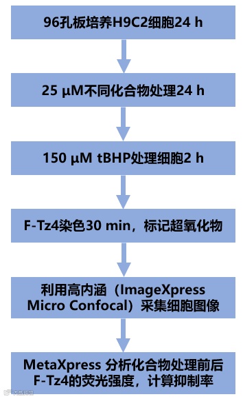接下来研究团队建立了高内涵抗氧化活性成分筛选流程,通过 150 μM 常用氧化剂——过氧叔丁醇(tBHP)诱导小鼠心肌细胞 H9C2 累积超氧化物,加入天然产物库中的 223 种化合物处理细胞之后,利用 F-Tz4(1μM)探针标记超氧化物含量,最后使用高内涵成像系统采集细胞图像并计算 F-Tz4 荧光强度和细胞数量,以此计算化合物对超氧化物累积的抑制率,筛选抗氧化活性成分(高内涵筛选流程见图 3)。