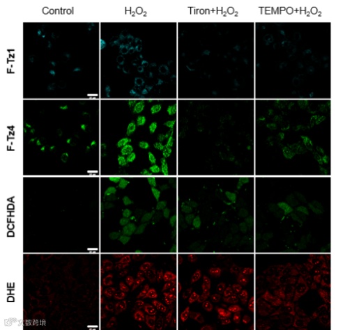图 2,四嗪类荧光探针与已知标记物 DCFHDA、DHE 在细胞水平对超氧选择性的对比。