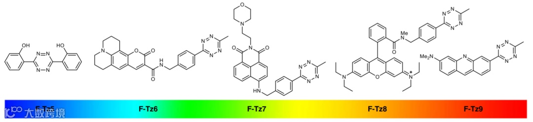 作者首先设计并通过实验验证了适用于从 445 nm~ 600 nm (蓝色~红色荧光)发射的系列探针(图 1),确认了该类探针在分子层面、细胞层面对超氧阴离子的高度选择性,及其相较于传统检测探针如 DCFHDA(非选择性活性氧探针)、DHE (超氧化物特异性探针)在选择性、信噪比方面的优势(图 2)。