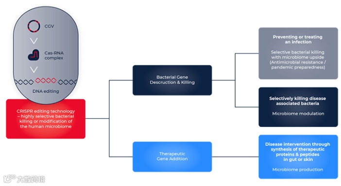 通过设计 CRISPR-Cas9 系统来切割特定的细菌 DNA 序列以消除致病细菌,这种特异性使 CRISPR 技术减轻对整体微生物组的破坏,实现药物发现进程的加速。SNIPR Biome 是积极致力于实现这一目标的公司之一,SNIPR Biome 副总裁兼 CRISPR 负责人和交付技术主管 Jakob Haaber 博士描述了 CRISPR 在致病性大肠杆菌消除中的应用:“我们使用 CRISPR 杀死大肠杆菌。目前,治疗细菌感染最常用的就是抗生素。但抗生素耐药性的发生率增加,进而使抗生素无效。CRISPR 的优点是它不区分抗生素敏感和抗生素耐药细菌。”他还建议,CRISPR 可以专门针对致病细菌,而不影响健康肠道微生物组中不可或缺的有益细菌,而不是像抗生素一样,对健康细菌和病原体都有影响。