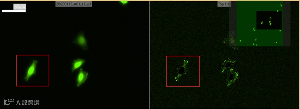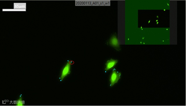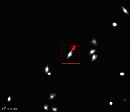 很多实验分析,我们只需要识别特定位置的目标。如下面的实验中,我们只需要识别聚集在细胞膜伸展位置边缘的蛋白聚集点,如红框内箭头所指的荧光聚集点。这些聚集点除了位置在边缘外,并没有区别于其他聚集点的任何特征(如红框圈出的细胞中箭头所指荧光点)。