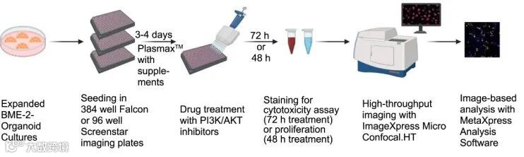 图 3. 使用高内涵对患者来源的类器官培养物进行基于图像的细胞死亡和增殖测定的实验工作流程。