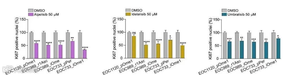 图 6. 使用 50 uM alpelisib、idelalisib 或 umbralisib 和 DMSO 处理 48 小时后,对类器官的基于图像的细胞增殖进行定量。图形表示 Ki67 阳性细胞核占 Hoechst 33852 阳性细胞核总数的估计百分比,随后归一化为 DMSO 对照值(DMSO 值被设置为 100% 增殖)。数据显示为三个实验的结果,三个对照,以平均值 ± SEM 表示。使用单向 ANOVA 结合 Dunnett 与阴性对照的多重比较计算统计学显著性。在所有情况下,p > 0.05、*p < 0.05、**p < 0.01、***p < 0.001 和 ****p < 0.0001。