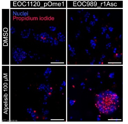 图 4. 用 DMSO(对照)和 alpelisib (100 uM) 处理后的类器官代表性图像。EOC1120_pOme1 代表 PI3K 通路没有改变的对照类器官系,EOC989_r1Asc 代表具有丰富 PI3K 活性的类器官系。药物治疗后,细胞核总数用 Hoechst 33342(蓝色)染色,用碘化丙啶(PI;红色)染色死细胞。使用 ImageXpress Confocal HT.ai 系统在 10 倍放大倍数下采集图像。比例尺,50 微米。