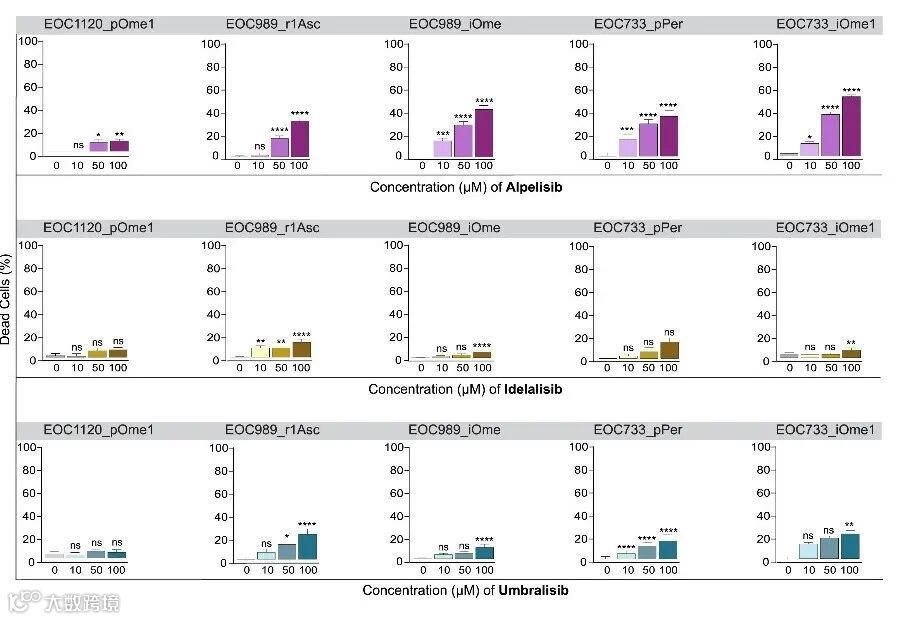 在所有富含 PI3K/AKT 通路的类器官中,观察到 alpelisib 和 umbralisib 具有显著的细胞毒性。在所有样品中,alpelisib 对细胞活性的影响最强,而 idelalisib 对细胞活性的影响最弱(图 5)。与作者的假设相匹配,对照细胞系(来自 EOC1120)对 idelalisib 和 umbralisib 完全耐药,并且仅对 alpelisib 的最高浓度有轻微反应(图 5)。