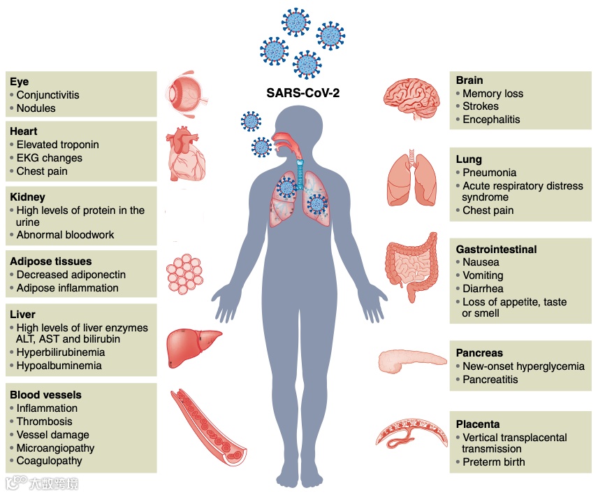 2019 年底暴发的新冠疫情迅速席卷了全球,严重威胁了全球人类的生命安全。SARS-CoV-2 不仅引起严重的呼吸道疾病,还会损坏大脑、心脏、肝、肾、肠道及胰腺等器官,引起诸如精神、认知及身体障碍、静脉血栓、心肌炎、心力衰竭、急性肾损伤、肝损伤及急性脑血管疾病等并发症(图2)。因此,科研人员迫切需要合适的体内及体外模型来研究 SARS-CoV-2 感染、病理生理学及药物和疫苗的筛选。由于类器官具备上文所提及的各种优势,并且多种器官的类器官被成功构建,所以类器官被广泛的应用于 SARS-CoV-2 的研究。