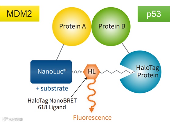 检测 p53-MDM2 蛋白相互作用:来自于 Promega 的 Nano BRET 技术,利用了 NanoLuc 荧光素酶作为 BRET 检测供体分子,标记有 HaloTag 荧光基团的蛋白发射 618 nm 荧光波长作为受体分子。