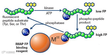 激酶检测:磷酸化和去磷酸化是蛋白的修饰过程,蛋白通过加上或脱去磷酸基团而获得或失去了活性。IMAP技术基于固定金属离子亲和技术,不需要抗体,而替代以一种极微小粒子,该粒子表面包被三价金属阳离子,标记物借助于固定在微小粒子表面的三价金属阳离子与第五的磷酸基团结合,从而引起极化值的变化。