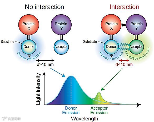 右图注释:Protein X 和 Y 分别与供体和受体相连,当 XY 之间没有相互作用时,距离较远,无法产生 FRET 信号;而当 XY 之间有相互作用时,由于距离靠近,使得供体和受体之间发生 FRET ,可以检测到受体的发射光信号。