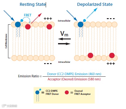 离子通道研究:电压敏感探针 Voltage Sensor Probes(VSP)是一种基于 FRET 的染料系统,用于测量细胞膜电位的变化。FRET 供体香豆素-磷脂(Coumarin-phospholipid,CC2-DMPE)只结合在细胞膜外侧。FRET 受体是可移动的、带负电荷的疏水性类菁染料化合物染料(Oxonol),根据膜电位变化结合在细胞膜的一侧。静息状态下细胞膜电位内负外正,受体在细胞膜外侧,能够与供体产生 FRET 信号。而离子通道打开,细胞去极化时,供体仍保留在外膜上,而可移动的受体则快速转位至细胞膜内表面,从而导致 FRET 信号减少,由此可以判断膜电位是否发生变化。