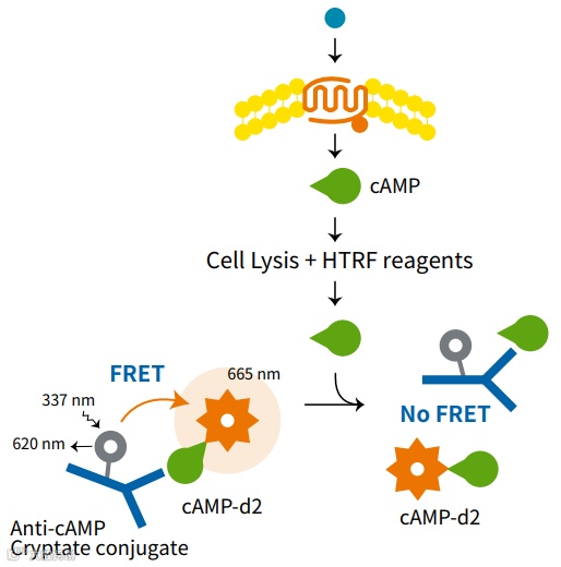 cAMP(Cyclic adenosine 3’, 5’–monophosphate)检测 HTRF cAMP HiRange 试剂盒可对细胞样品中的 cAMP 进行定量,cAMP 是 G 蛋白偶联受体(GPCR)信号传导中的关键第二信使。配体与 GPCR 结合后,会发生构象变化,激活受体,进而激活 G 蛋白。进一步的信号转导取决于激活的 G 蛋白的类型。Gs 蛋白的活化导致腺苷酸环化酶对 cAMP 的上调。细胞产生的游离 cAMP 与 d2 标记的 cAMP 竞争结合抗 cAMP 穴状化合物,因此细胞 cAMP 的增加导致 FRET 的减少,这可以通过 665 nm 发射的荧光减少来检测(下图)。