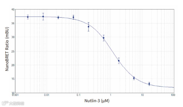 注释:nutlin-3 对 p53-MDM2 相互作用的破坏,信号值随 nutlin-3 浓度增加而降低。