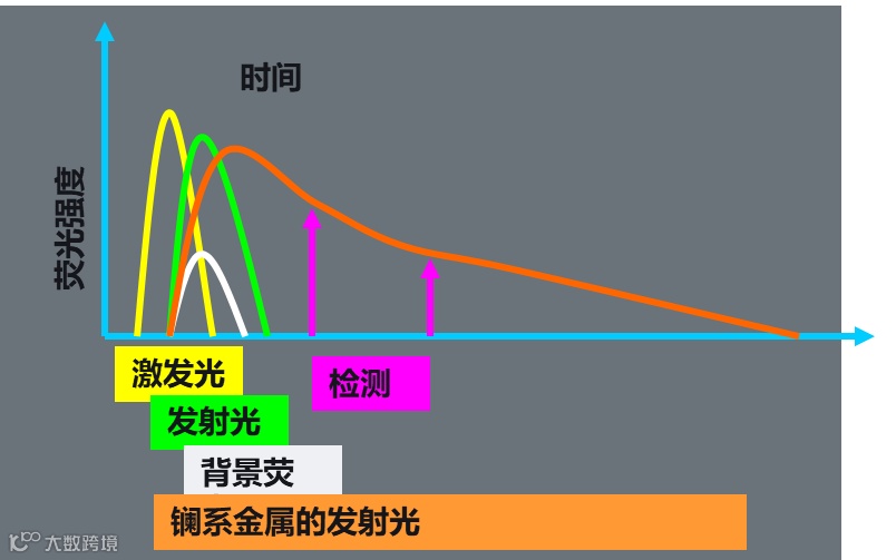 注释:镧系元素发射光(橘黄色曲线)维持时间要长于普通荧光染料(绿色曲线)