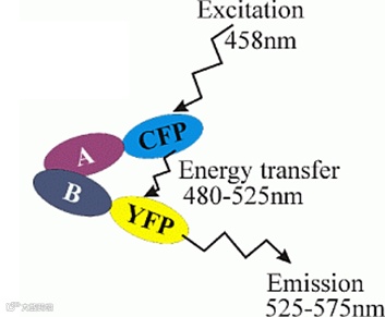 注解:A、B 为两个生物大分子,分别与供体 CFP 和受体 YFP 相连,通过供体-受体的 FRET 信号,可以得知 A 与 B 是否存在相互作用。