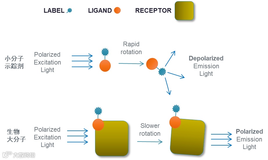 当荧光分子受平面偏振光激发时,如果分子在受激发时期保持静止,发射光将位于同样的偏振平面。如果在受激发时期,分子旋转或翻转偏离这一平面,发射光将位于与激发光不同的偏振面,这一现象称为荧光去偏振。FP 用于检测溶液中生物大分子与小分子之间的相互作用,大、小分子未结合时,荧光标记的小分子运动速度快,发射光去偏振化,检测到低的毫偏振值(mP);而当荧光标记的小分子与生物大分子结合后,旋转变慢,发射光保持偏振性,检测到高的毫偏振值(mP),mP 值的高低与分子相互结合的效率成正比。