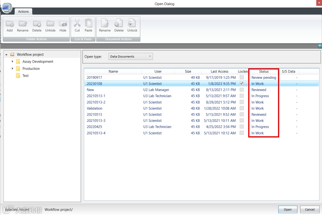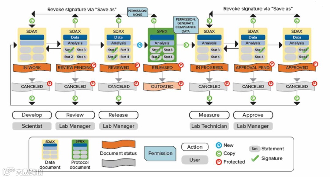 如 Scientist 权限新建数据状态是 in work 表示正在进行模板方法开发,经过 Lab Manager 层层审批并电子签名后可以更改文件状态并将开发好的模板 release 出来,这时 Lab Technician 才有权限打开模板进行读板和数据分析,签名后数据将被锁定不可更改,Lab Manager 审核后电子签名 Approved。如果发现数据有问题,可以 canceled;如果因为改进流程更新方法模板,可以将更改旧模板状态成 outdated,并不赋予 Lab Technician 打开 outdated 权限,以免使用错误模板读板产生不合规的数据。