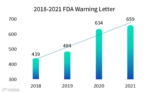 与纸质记录相比,电子记录是动态记录必然会暴露出更多的不合规操作, 2015 年警告信 FDA 483 表格和现场观察报告频频出现,全球各地监管机构再次更新和完善了一轮法规要求。新法规施行后(2018 版 FDA 21CFR Part11),我们看到如下图统计,最近几年 FDA 发出的警告信也呈现出逐年上升趋势。作为合规软件的供应厂商,我们也明显感受到国内客户对于合规的要求也是越来越高。
