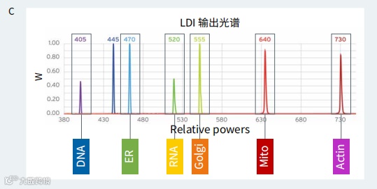 图 2 Cell Painting 实验改进使用远红外光源的改良方案,以改善 Cell Painting 实验中的光谱分离。A ) Phalloidin Alexa Fluor 750 用于在改良方案中标记肌动蛋白。显示了来自对照孔的示例图像。插图 ( 白色框 ) 被放大,显示为细胞核 ( 蓝色 ) 和高尔基体通道 ( 黄色 ) 的合成图。高尔基斑点明显分布在核周组织中。B ) 细胞用粉防己碱处理的图像。左边是肌动蛋白和高尔基体通道叠加的重建图像 ( 黄色 )。右边显示只有高尔基体 ( 黄色 ) 和细胞核 ( 蓝色 ) 的图像。改良方案中粉防己碱对高尔基体分布的影响更为明显 ( 右 )。C ) 激光光源及其相对功率显示。标示展示了各个光源检测的细胞区域。