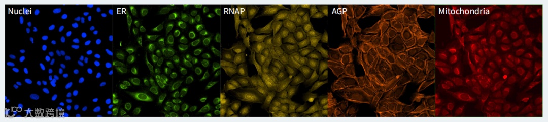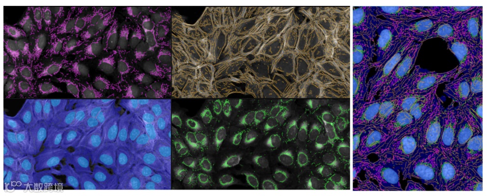 图 1 Cell Painting 检测。细胞染色的例子,Cell Painting 实验使用以前发表的方法。值得注意的是高尔基体和肌动蛋白结构是在同一个通道 ( AGP ) 中采集的。肌动蛋白染色表现为丝状结构。然而,高尔基体是不容易被眼睛区分的。