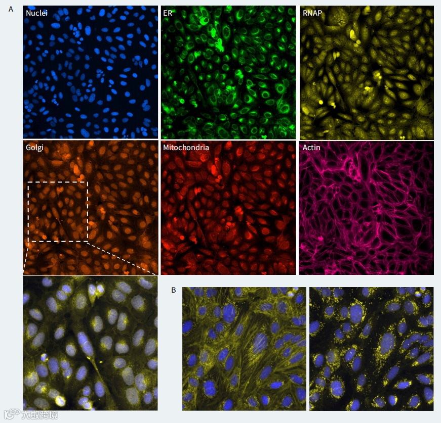 在标准的 Cell Painting 实验中,各种细胞器和结构 ( 细胞核、细胞质、线粒体、高尔基体、内质网、细胞骨架、胞 质 RNA 和核仁 ) 在 5 个成像通道中被采集。这种广泛的细胞染色能够以单细胞分辨率对多种形态的扰动进行监测和定量。已发表的 Cell Painting 分析的局限性包括适合的染料可用性狭窄以及成像系统提供足够的光谱分离能力。具体来说,高尔基体和肌动蛋白是通过同一通道成像的,这就给图像分析中区分这两个结构带来了挑战。这种限制可能会干扰 hit 的选择或掩盖某些化合物的效果,特别是那些具有影响高尔基体 ( 生物合成途径 ) 或细胞骨架网络的作用机制 ( MOA ) 的化合物。