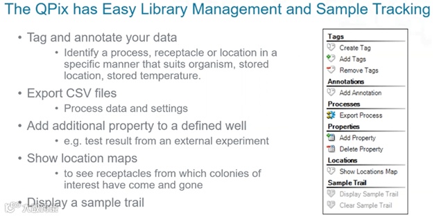 QPix 420 系统可以辅助数据收集和存储。Actuator Head 包含一个内置的高分辨率摄像机和一个条形码读取器,以实现可靠的数据可追溯性。图像数据被记录到具有广泛审计跟踪和样本跟踪选项的内置数据库中。基于条形码读取,QPix 软件可用于跟踪有关克隆的信息,如其在源板和目的板中的位置以及挑取的日期和时间。您还可以选择为重要样本定制标签,并根据克隆的形态特征对其进行分组。