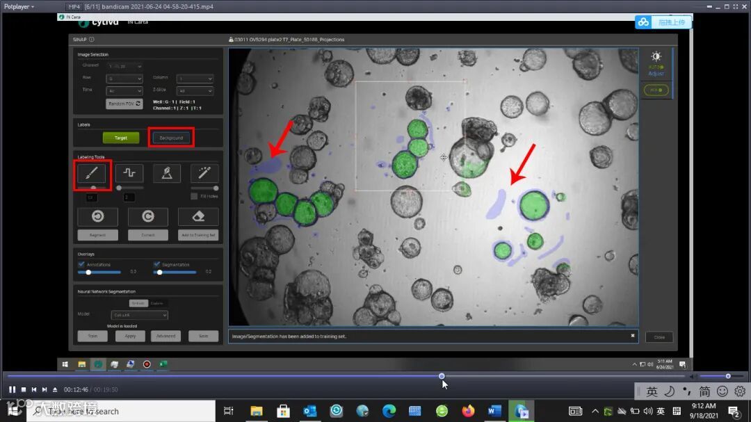 如上图,在软件中使用画笔圈选不同形态和灰度值的球体部分(绿色)训练软件识别