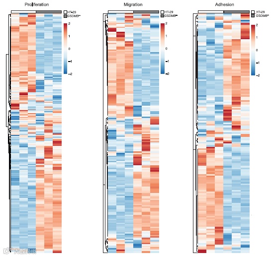 此外,通过对野生型 HT-29 和携带突变型 GSDMB 的细胞做 RNA-seq 分析,显示二者在与增殖、迁移和粘附相关的基因中存在明显差异,而且后续实验也发现,与野生型相比,突变型 GSDMB 对敲除 GSDMB 基因后的体外肠上皮细胞的愈伤功能的恢复效果较弱。该结果进一步证实了 GSDMB 在调节肠上皮细胞增殖和迁移中发挥的作用。