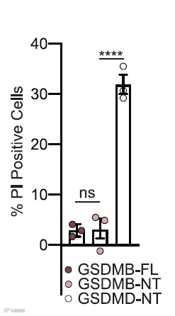 随后研究人员筛选出 HT-29 细胞系用于 GSDMB 的内源性表达,并选用甲氨蝶呤作为 GSDMB-FL 的诱导物。免疫标记实验结果显示甲氨蝶呤能够诱导 GSDMB-FL 表达上调,并易位至质膜,但是细胞对碘化丙啶(PI)的摄取并不显著增加,因此可以判定该过程并不诱导细胞裂解死亡。