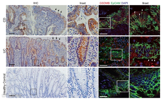 研究人员通过对健康、患有克罗恩病(CD)和患有溃疡性结肠炎(UC)的受试者分别进行肠道活检取样,通过免疫组化染色和生化实验,发现 GSDMB 在患者样本中的表达量显著高于健康受试者样本(Figure 1),且主要集中在肠上皮细胞内(Figure 2)。这些细胞显示出与细胞增殖、迁移和粘附相关的丰富的基因信号通路,但不存在细胞焦亡现象。