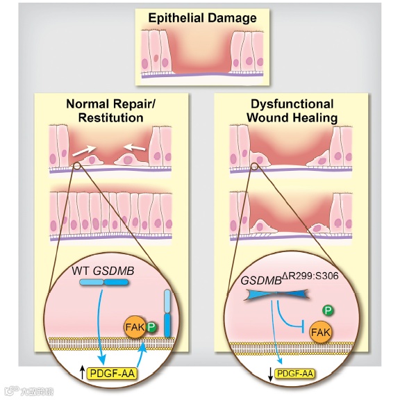 GSDMB 是肠道上皮屏障功能恢复和肠道炎症消退的关键因素,主要通过介导粘着斑激酶磷酸化通路,利用细胞增殖、迁移和粘附等功能来促进肠上皮细胞恢复和修复,对炎症性肠道疾病患者在疾病缓解期促进粘膜伤口和溃疡的愈合尤为重要。该研究结果为开发针对 GSDMB 的治疗策略奠定了基础,能潜在地用于改善肠道上皮修复和炎症消退的效果,同时也能够帮助更有效地治疗影响肠道屏障功能的疾病,比如以克罗恩病和溃疡性结肠炎等为代表的一类炎症性肠病。