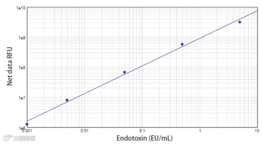 标准品浓度作为横坐标绘制线性标准曲线(见下图),得到 R2 值为 0.996 以及比产品说明书建议的范围(0.005 EU/mL 到 5.0 EU/mL)更低的内毒素浓度。