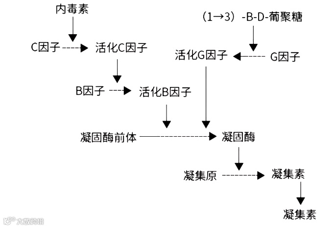 它的最典型特征是血液为蓝色,这是因为它血浆的主要成分是血蓝蛋白,含铜量很高,由于鲎肉含有对人体健康和生命安全产生极大危害的成分,故不宜食用。但是科学家从它们身上发现了更加重要的价值,即从它们独特的蓝色血液中提取出变形细胞溶解物制成试剂后,可准确、快速地定性或定量检测样品中的细菌内毒素,这种提取物一旦接触内毒素就会凝固。正是这样一个发现,使人们将鲎试剂作为最主要的一种内毒素检测试剂。目前使用的鲎试剂分为美洲鲎试剂(LAL)和东方鲎试剂(TAL)两大类,检测原理和效果一样,其原理如下图: