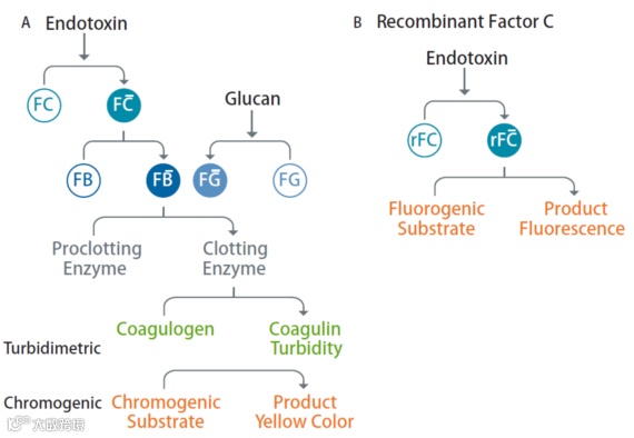 本法所用试剂不含有 B 因子和凝固酶原、凝固蛋白原等,因此,含有对上述物质抑制或增强作用的样品适合使用重组 C 因子法。鲎试剂与重组 C因子法反应原理的比较如下图所示: