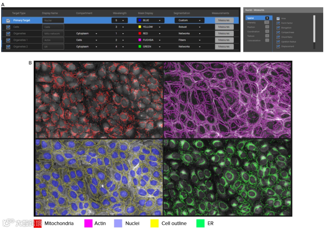Figure 3. IN Carta 软件中的特征提取。在 IN Carta 软件中创建分析方法用于分割各种细胞结构。在这里,我们使用内置的细胞核模型来实现所有处理中细胞核的准确分割。其他细胞特征,如细胞质室,肌动蛋白丝网络,内质网和线粒体也被指定模式分割。在分析设置期间选择与强度,纹理,共定位和形状相关的测量数据。我们总共选择了 280个细胞和亚细胞结构的测量指标。A) 分析方法设置的屏幕截图。在“measurements”下选择要输出的数据类别,图中展示的是在“Spatial”选项下可用分析项。B) 在IN Carta软件中样品图象的识别标识。