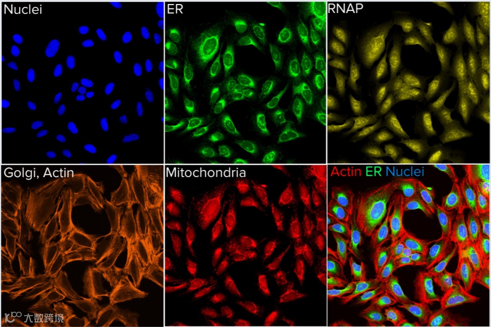 此分析方法是使用多达六种荧光染料用于标记细胞的不同成分,包括细胞核、内质网、线粒体、细胞骨架、高尔基体和 RNA。这些细胞结构的形态特征的参数集,包含强度、纹理、形状、大小,组成了细胞表型“指纹”,用于指示细胞所处的不同的生理学状态。通过更优化的形态学分析,评估分子或遗传干扰的生物学影响 [2,3,4]。