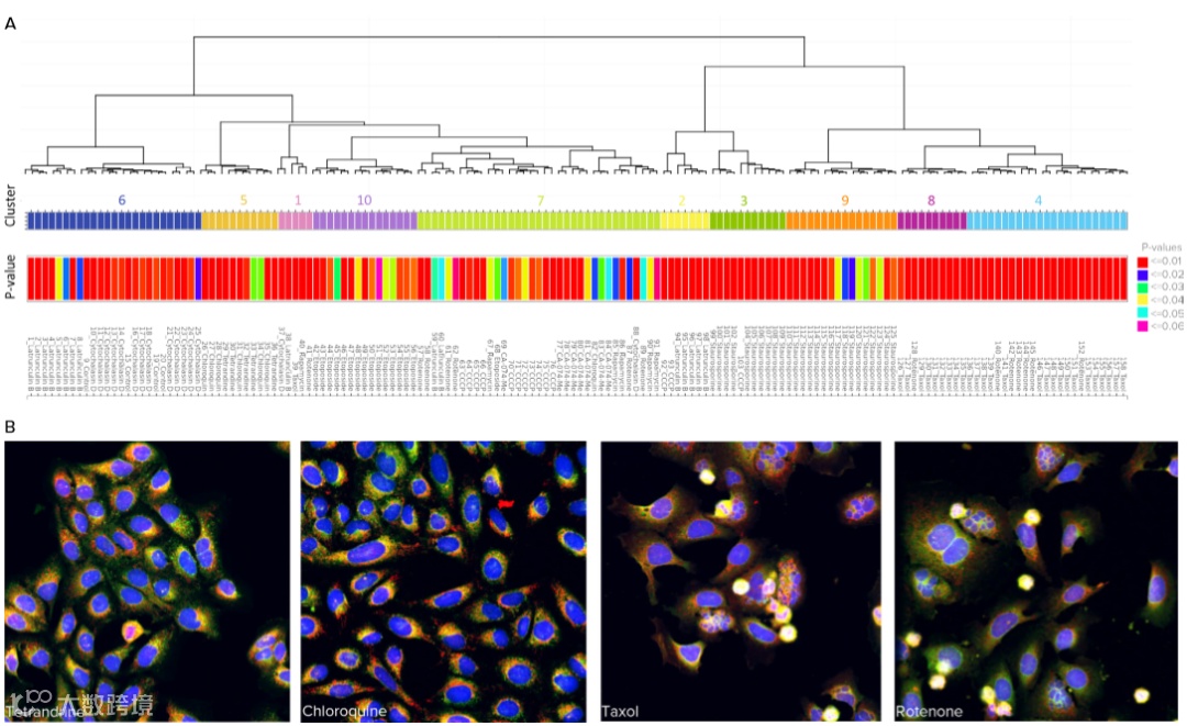Figure 5. 聚类分析。A) 树状图显示了分层关系。属于同一簇(编号)的孔由彩色条表示。图中标识了每个孔的基于距离评价的P值。B)属于相同簇的化合物处理的细胞在图中展示出来。簇5由粉防己碱和氯喹处理的细胞组成。注意两个孔中 ER斑点的数量增加。簇 4 由鱼藤酮和紫杉醇处理的细胞组成。注意这些孔的一些细胞中存在泡状结构,表明细胞毒性的作用。